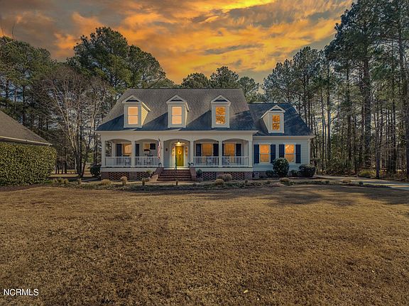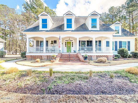 Immaculate, custom-built home located in the desirable golf and waterfront, gated community of Albemarle Plantation. As you enter this 4,125 sq', 4 bedroom, 3.5 bath beauty you will be greeted by the many recent upgrades and quality craftsman detail. The expansive front foyer and formal dining area boasts gorgeous, coffered ceilings. High vaulted ceilings in the great room with built-in cabinetry continue the truly high end feel. A lovely see through fireplace in the great room shared with the sunroom adds even more charm and open feel. Protected views of the 12th fairway from the sunroom and attached deck are perfect for getting together with friends or a quiet evening just relaxing and enjoying the natural beauty of the area. The updated chef's kitchen features stainless steel appliances and tons of beautiful cabinetry with a walk-in pantry. A conveniently located half bath and laundry/utility room lead to the 2.5-car attached garage and round out this great space. The huge first level owner's suite has additional built-ins and a recently remodeled bath boasting a large soaker tub, walk in shower and oversized closet. Two staircases lead up to the second level with a large entertainment/media area and an adjoining home office. A second bedroom suite and two additional bedrooms and full bath are also located on the second level. The home is wired for a whole house generator and features a tankless hot water heater, 4 zone heat and air, water softner, new Sunbrella motorized awning on the deck and an irrigations system. This beautiful home is just a short walk or golf cart ride from the many amenities that Albemarle Plantation has to offer including two restaurants, 160 slip marina, golf, tennis, community pool, community center with work out facility, dog park and much more. Give me a call today for a private tour of this beauty and learn more on all that the community has to offer.