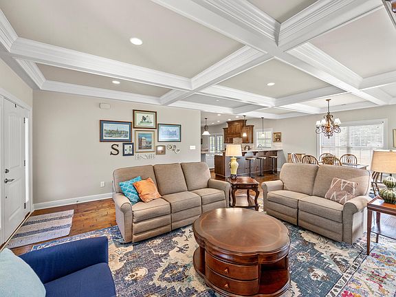 The gourmet kitchen is a chef's dream, featuring premier Bosch stainless steel appliances, a large granite island, and a spacious pantry closet with custom shelving. An elegant coffered ceiling in the family room, and an additional cozy sitting area with gas fireplace flank the kitchen. Plantation blinds, and windows everywhere allow an abundance of natural light and enhance the open living spaces, creating an inviting atmosphere throughout.