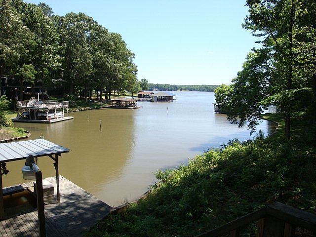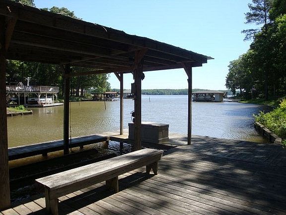 Great lot looking right at the main lake on south west end of lake close to I-85. 1991 mobile home with two large bedrooms and two bathrooms, central great room which opens out to large covered porch and large deck lakeside. The view is lovely and there's a single boathouse and partially bulkheaded waterfront. Furniture and furnishings convey. Have upgrade permit for 3 bedroom home if you want to put a double wide or modular on the lot.