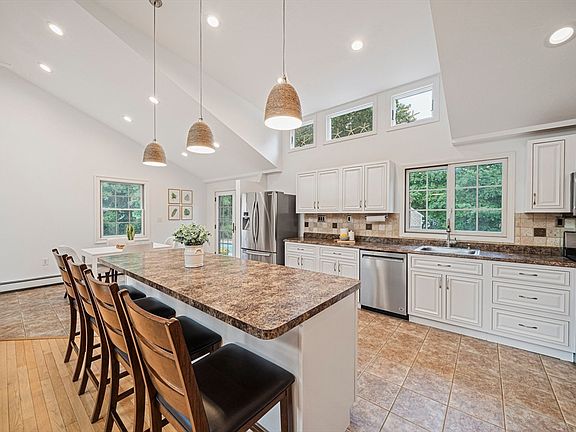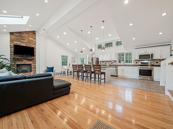 This lovely remodeled contemporary cape located in the desirable "Seaview" area of Marshfield features a bright open floor plan on the main level with a vaulted ceiling living room with skylights, welcoming brick fireplace and a kitchen with upgraded cabinets, stainless appliances, large entertaining island and dining area. The upper level has three spacious bedrooms and a full bathroom with laundry. There is also a convenient home office with sliding doors and a half bath. The lower level features a terrific family room. The backyard oasis with a large gazebo covered Trex deck leading to a renovated heated salt water pool is the perfect place to relax and entertain. Short distance to Humarock Village for beach, restaurants, marinas and more! 2 Car garage. Central Air. This meticulously maintained and updated home is a true delight! OFFERS DUE BY 5:00PM SUNDAY SEPT.29. Expiration to be Monday Sept 30th at 5pm.