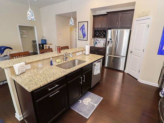 - RoomKitchenFeatures: Granite Counters, Kitchen Island, Recessed Lighting, Eat-in Kitchen, Floors-Hardwood, Cabinets-Stained, Bar