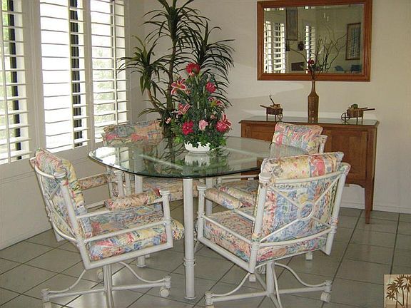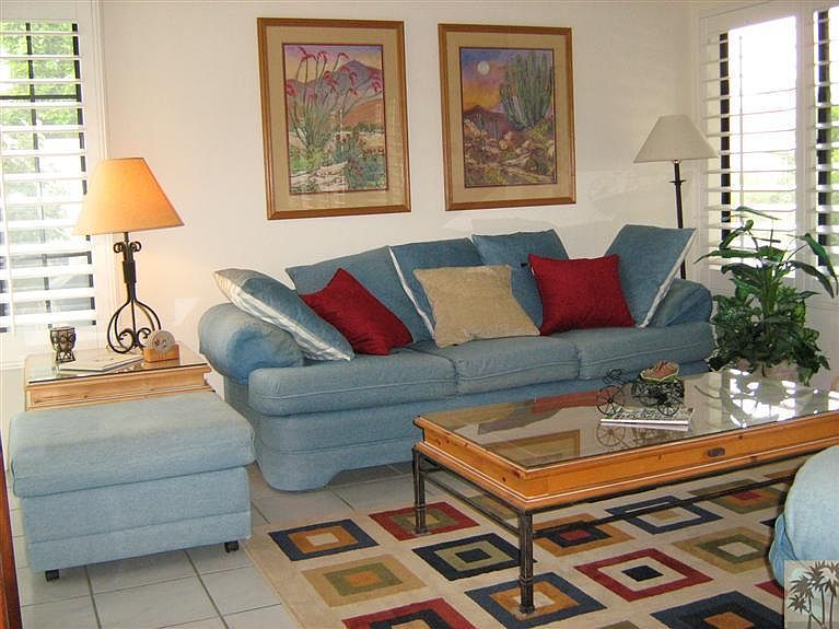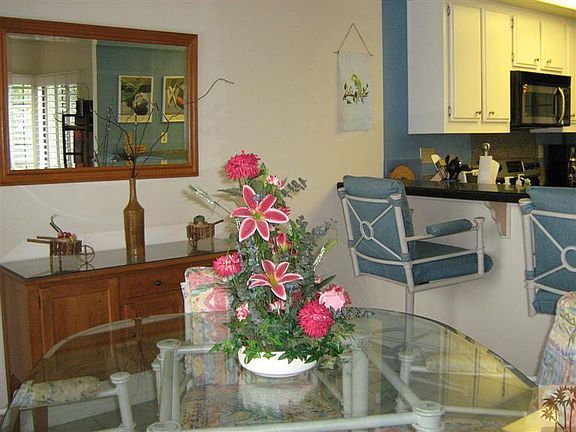 Talk about comfortable and pulled together. This unit is it. You'll feel right at home during your stay. This home offers two bedrooms (King/Queen beds) two baths and good separation for privacy should you have guests. There are large screen televisions in both the living room and Master bedroom. You can dine at the dining table, at the kitchen table, at the breakfast bar or outside at the patio table. The pool is just steps away across the lawn. Situated at the corner of Country Club and Portola, you have groceries in both directions and are close to all the activities our valley has to offer. Leased until April 30 2016.