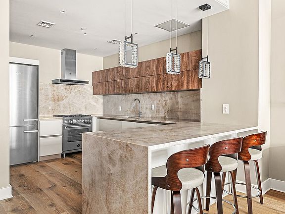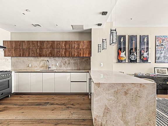 The upgraded chef’s kitchen is open to the living room and features custom cabinetry with expert storage by Bauformat, newly installed Taj Mahal marble countertops and backsplash, and is complemented by a suite of A-grade appliances, including a Miele refrigerator, Bertazzoni range with exhaust hood, Bertazzoni dishwasher and an XO wine refrigerator.