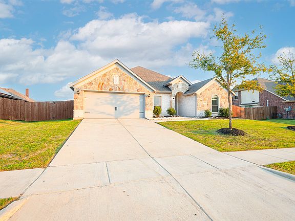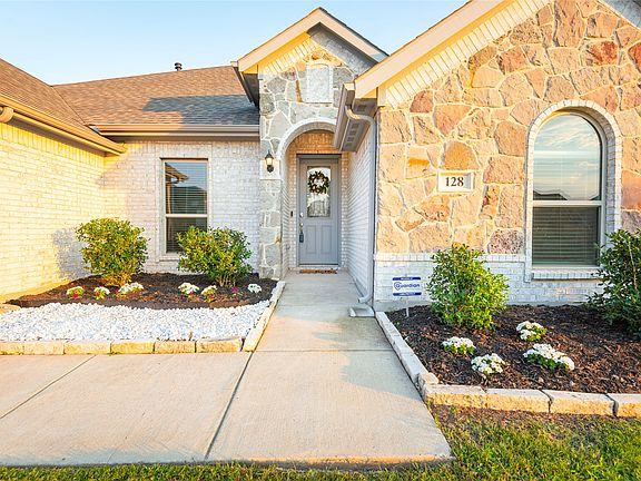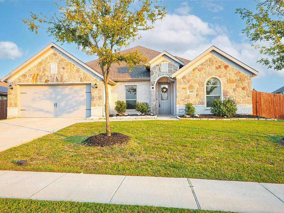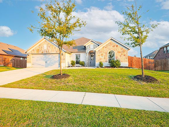 Nestled on a large, landscaped lot, this beautiful home features an eye-catching brick and stone elevation that exudes charm and elegance. Step inside this green energy home to discover luxury vinyl plank flooring throughout the main living areas and plush carpet in the bedrooms for added comfort. Just off the entry, a private study sits behind elegant French doors—perfect for working from home. The open-concept family room is anchored by a cozy fireplace and flows seamlessly into the eat-in kitchen, creating the ideal space for gatherings and everyday living. The chef’s kitchen is a dream, boasting granite countertops, a large island, stainless steel appliances, a gas cooktop, and ample cabinet space. Retreat to the spacious master suite complete with dual vanities, a relaxing soaking tub, a walk-in shower, and generous closet space. Enjoy outdoor living year-round with a covered back patio that overlooks a large, lush backyard—perfect for entertaining or relaxing in your own private oasis. This home offers a perfect blend of style, comfort, and functionality and is complete with solar panels for a green energy home that benefits it's owners with lower costs.