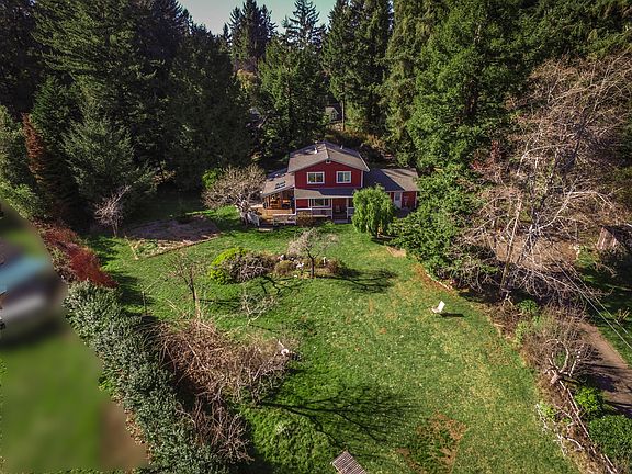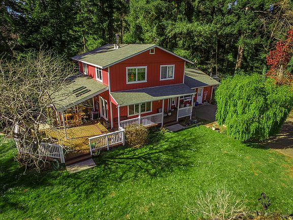 Private location ringed with redwoods and plenty of garden space on 1.45 acres. Fruit trees, covered front porch and extensive decking with lovely space for entertaining. Hot tub and outbuildings. Home features hardwood flooring, maple kitchen with farmhouse sink. Large, tiled sunroom, plus family room. Oversized laundry room has pantry shelving and storage space. Additional workshop area. Idyllic setting and privacy, yet close to town!