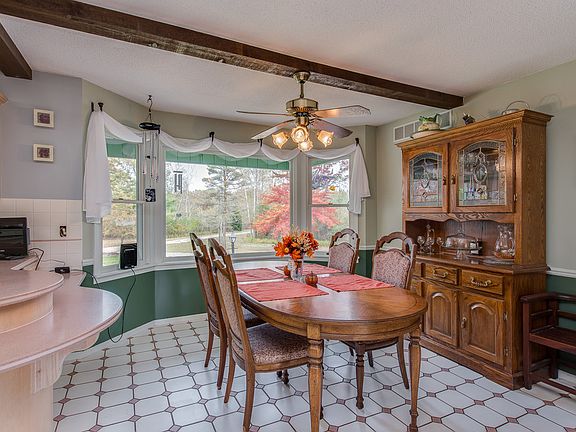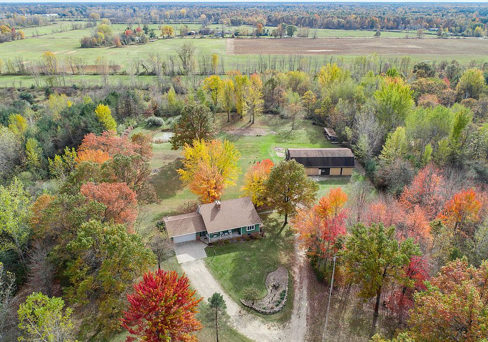 Country Estate on 10.17 acres! Well maintained Raised Ranch on beautiful, private 10 Acre wooded setting with large pond, natural gas & city water! Perfect for retirees or family with 2 main floor living spaces and finished walkout lower level. Open layout to family room with access to multi-level deck and flex room with 2nd fireplace. Main floor master bedroom suite with private balcony. Walkout lower level inc. 1200 sq.ft finished living space with 2 BR/1 Bath/Utility room/Kitchenette, & Family Room with walk out french doors to patio. Perfect space for extended family! If you require a workshop or hobby barn, you'll love the 40x70 Amish built barn with hip roof, 5 sliding doors, insulated 40x40 shop, 30x40 cold storage, & 2 lofts! Water and underground gas line to barn. Hydraulic Hoist & 5 Horse 80 gallon Air Compressor can be included. Fantastic Location with Midland schools and easy access to U.S.10. Gorgeous private setting with great hunting, fruit trees, large garden space.