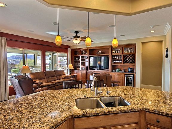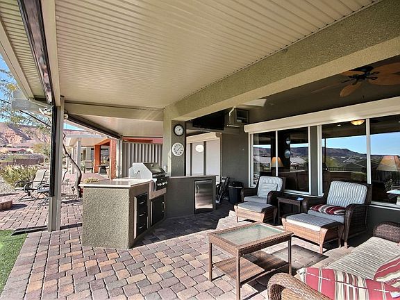 SIDS PAID IN FULL ($5,449.25)!! Pride of ownership is evident as you experience this gorgeous Laurel, which includes 1571 sq.ft., 2 bedrooms + den, 2 baths, 2-car garage. Elevated above the homes below, with a beautiful southern view of the Virgin Mountains and a view of Flat Top Mesa to the west! The upgrades include a fully remodeled kitchen with flat extended island, double convection wall ovens, cooktop, granite countertops & full backsplash, pull-out lower shelves, upgraded dishwasher/garbage disposal/faucets; remodeled walk-in tiled shower @ master bath & added linen cabinet; master closet organizer, 18" tile thru-out living areas, electric shutters/solar screens on all windows (except master bdrm), outdoor patio with built-in BBQ, fridge, putting green, pavers @ patio/walkway, awning! Experience resort-style living at Sun City! Indoor and outdoor pools, spas, fitness facility, golf course, 18 hole putting course, tennis, pickleball, bocce and much more! A MUST SEE!