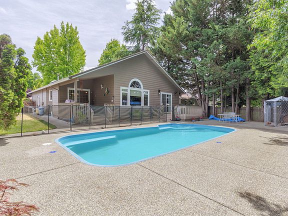 Located in a charming neighborhood with community Rogue River access, this lovely home has so much to offer! Come into the front entry to an expansive ceiling & immediately feel the character this home has throughout. Featuring 3b/2b; 1,642sf; vaulted ceilings in the living room, front bedroom & primary bedroom; large primary ensuite with separate outdoor patio area, walk-in closet, walk-in shower, jetted tub & double sinks. Living room is spacious; kitchen has two ovens for those holiday gatherings, breakfast bar, pantry & plenty of cabinets. Loads of storage throughout the home; large windows, sliders & skylights let the natural light in. The perfect backyard is ready for you to take a splash in the inground pool or enjoy the covered patio. RV parking, dog kennel & shed are all a plus. This is a must see!