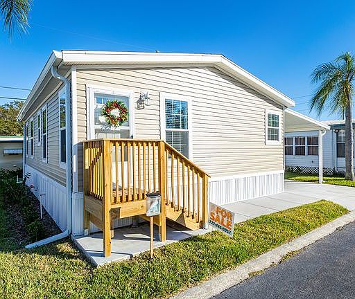 Brand new 2 bedroom 2 bath cottage home only a few minutes from the beach. Free lot rent is almost $5,000 in savings.*This home is impressive both inside and out. Highly upgraded home model with designer touches throughout. Open kitchen with stainless appliances plus island for easy entertaining. Master bedroom has walk-in closet and shower. Guest bedroom has bathroom with shower tub. Upgraded vinyl plank floors. Brand new HVAC system. Patio. Carport covers 2 cars. Dry storage shed. Colorful landscaping with sprinkler system. Included amenities with lot rent: water, sewer, twice weekly trash pickup, lawn maintenance and brand new activity center with exercise room, pool table, library, computer area, kitchenette and enclosed outdoor seating with lounge furniture and umbrellas.Make your appointment to see this home today! Bring your fur babies! Two pets at 25 lbs each permitted and no pet fee.Cottage Cove is a low-maintenance and affordable manufactured home community in Clearwater, FL for adults 55 and older. Imagine living in this beautiful, vibrant oasis amongst the shade of palm fronds, surrounded by the country's best beaches and the crystal blue Gulf. At Cottage Cove, you can create new memories, form new friendships, and enjoy the life you've always dreamed of.*Buyer must pay first month's lot rent at time of closing. Free lot rent applies to months 2 - 8.
