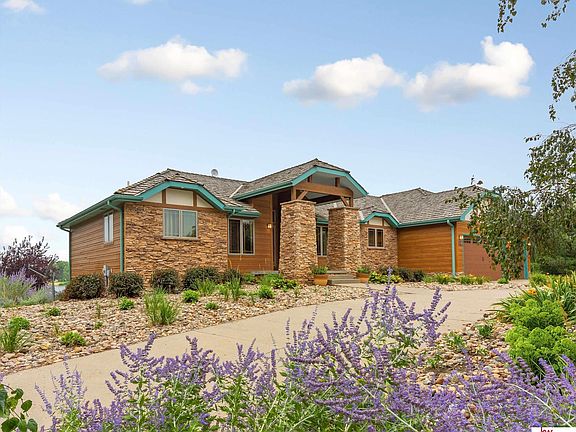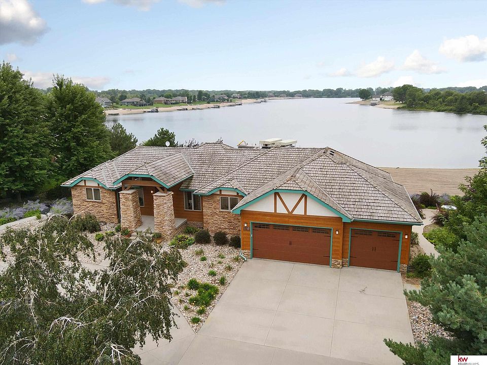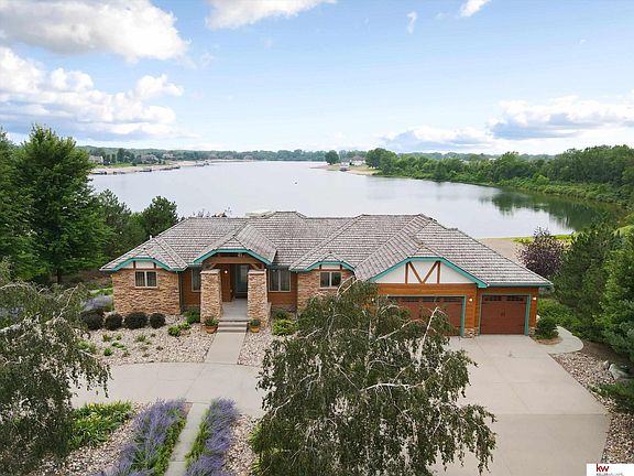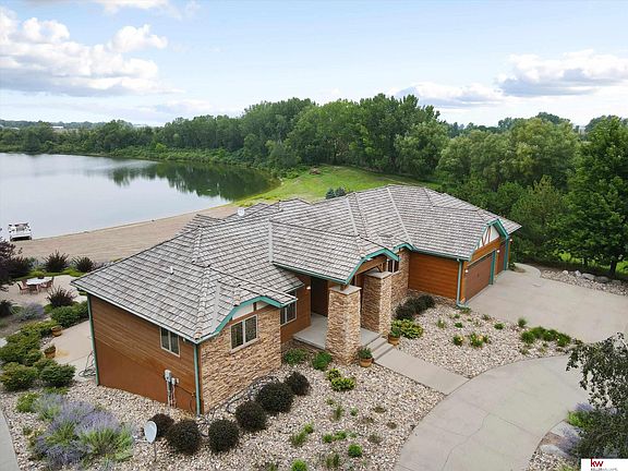Contract Pending - ON MARKET FOR BACKUP OFFERS! Welcome to your dream lakefront property just a 30 min drive to Omaha! Craftsman-style home offers a picturesque escape, situated on an 80-acre sandy bottom lake with lake views from every bedroom in the home! Professional landscaping beautifully wraps around the entire home. Enjoy your morning coffee on the composite deck! Walk down to your private beach & enjoy the sandy shoreline and tranquility of the water. The primary suite boasts two walk-in closets, offering ample storage for your wardrobe. This property has you covered with a utility garage at the back of the house, providing space for your recreational equipment. After a day of fun on the lake, you can easily access the 1/2 bath to clean up before heading inside. Laundry facilities are conveniently located on the main level with additional hookups in lower level. In addition, you will find an in-law suite, kitchenette, living room, large flex room & bath in the lower level.