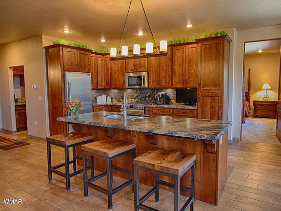 This exquiste custom home has only 1 step entry both front door & garage. The .69 acre lot with excellent tree cover borders green space offering privacy and beauty. It is one of the best locations in Snow Creek. With a split 3 BR, 2.5 BA featuring an open floor plan with spacious indoor and outdoor living areas. The master bath has a large soaking tub, walk in shower, and split vanities. Master, foyer & office closets are custom California closet type. Other high quality finishes include custom cabinets, premium granite countertops, wood plank tile flooring, and rock faced natural gas fireplace and so much more. The 4 car tandem ( 946 sf) garage is heated & cooled, with sink & utility door. Stand up height with concrete pad under house could easily be another workshop... see more Snow Creek is in a secluded area of Show Low and features the security of a gated community together with improved walking trails throughout extensive open space. It is the fastest growing and highly desirable community in the White Mountains with 120 new homes constructed in the last 3 years. The development has easy access to all the amenities that the town of Show Low has to offer. Improvements include paved streets, and underground utilities including power, natural gas, cable TV, city water & sewer. See Feature List in Documents.