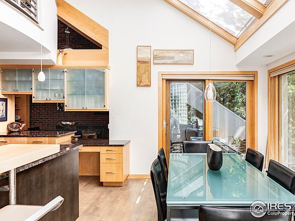 South Boulder's iconic outdoor playground unfolds right outside your door in this contemporary residence featuring soaring ceilings, breathtaking mountain views and access to the private Devil's Thumb community pool and tennis courts. Move right in or put your personal stamp on this expansive indoor-outdoor retreat. Remodeled in 2004, the home impresses throughout with bespoke details and beautiful finishes, including premium wood, swaths of brick and stained glass, and a thoughtful layout with outdoor space on every level. Enjoy magnificent natural light in the living and dining rooms thanks to massive windows, skylights and walls of glass brick. Chefs will feel right at home in the large open kitchen filled with custom wood cabinetry, granite counters, a pantry and upscale stainless steel appliances. A family room boasts wood paneling, a fireplace and an oversized deck. The breathtaking owner's suite wows with vaulted tongue-and-groove ceilings, a private terrace, a fireplace and an extra-tall walk-in closet. In the en suite bathroom, a jetted tub, shower and separate vanities create a spa-like experience. Head to the walkout lower level to explore a spacious rec room that opens to the gorgeous 15,109-square-foot property. Embrace al fresco dining and lounging on brick patios featuring an outdoor fireplace, water feature and well-stocked summer kitchen wrapped in lush landscaping and Flatirons vistas. Manicured landscaping and towering trees add exceptional curb appeal to this custom Boulder retreat - just across the street from fantastic open space trail access. The neighborhood offers award-winning schools, including Bear Creek Elementary. Nearby, Table Mesa Shopping Center offers Whole Foods and local favorites. Downtown Boulder and Pearl Street are just 10 minutes from this secluded South Boulder enclave.