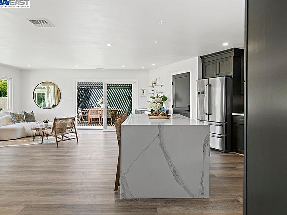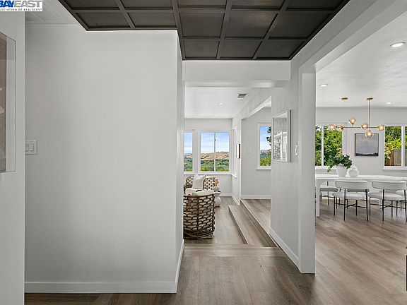 This sophisticated view property is located in tranquil Parkridge Estates. As you enter, you'll find a welcoming contemporary floor plan with mesmerizing views and an abundance of natural light. A spacious sunken living room with stacked stone fireplace opens onto the heart of the home - dining lounge and kitchen. The chef inspired kitchen boasts a 36” range, quartz counters & backsplash, a large island, and separate wet bar with wine chiller. This lounge area seamlessly extends outdoors to a dining deck with louvered pergola. The primary retreat wing provides for exceptional separation of public and private spaces. Features include a study that leads to a serene sleeping room with fireplace, catwalk deck, and Mount Diablo views. The primary bath features a night lit double vanity, a double walk-in shower, and luxurious heated floors. Two additional bedrooms are located at the front of the home and share a well-appointed hall bathroom with heated floors. Large and nicely finished 2-car attached garage. Perched on the edge of Redwood Regional Park, this property feels a world away. The flagstone patios and terraced landscape make for memorable entertaining or just daydreaming and stargazing over Moraga Canyon and beyond as far as the eye can see.