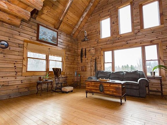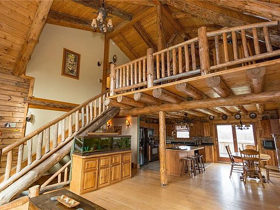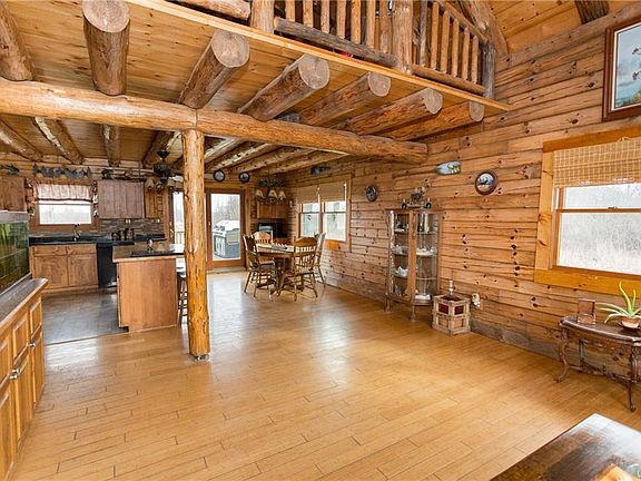 ONE OF A KIND LOG CABIN!Truly a once in a lifetime with modern amenities & beautiful scenery!Built in 2004,this log cabin is situated on 5.5 acres that is zoned for 3 horses.Expansive back deck overlooks your pond with koi fish,screened in back porch,& oversized garage w/loft.Walk into your open floor plan including living & dining rm, & kitchen w/ granite.First floor bedroom, full bath, & mudroom!Upstairs has an oversized loft & master suite w/walk in closet & bath w/dual shower heads!Basement rec room has a bar & exercise room!Many updates!Have your own apple, pear, & cherry trees!