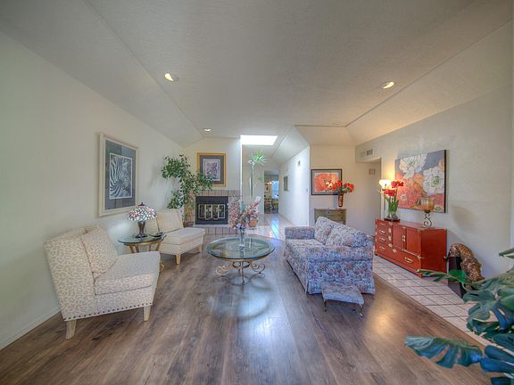 Beautiful Townhome in a Highly Desired Area! This Home Offers a New Membrane Roof (2022), 4 New Skylights (2022) and Stucco (2023)! The Open Floor Plan Includes Two Spacious Bedrooms, Primary Has an En Suite Bathroom, Shower and a Walk-In Closet and Access to the Sunroom! The Spacious Great Room Has Elevated Ceilings, Recessed Lighting, Wood Burning Fireplace and Opens to the Front Courtyard! The Remodeled Kitchen Has Solid Surface Counters, Soft Close Drawers and Cabinets, Pantry, Frigidaire Dishwasher and Stainless-Steel Appliances! In Addition to the Front Courtyard There is a 153 Sq' Sunroom, Not Included in the Square Footage! This is a Must See!