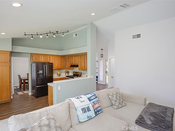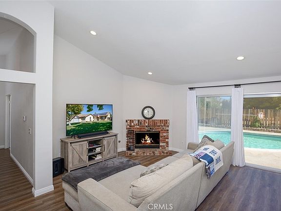The nicest home on the street is up for sale! This is an amazing opportunity to own a 4 bedroom, 2 bath single story pool home with a 3 car garage! You'll enter into a large living room and formal dining area with high ceilings, contemporary light fixtures, and newer vinyl plank flooring. The kitchen is open to the family room, and has a pretty view of the pool. The primary bedroom has a slider to the back yard, and a recently remodeled full bath. The other 3 bedrooms share a hall bath. You'll appreciate the indoor laundry area, and the reverse osmosis / water softener system will stay. The solar panels are leased thru Sunrun, The lease is only $111/month and is fixed for the next 10 years. In addition to the solar, the other energy efficient upgrades include double paned windows, ceiling fans, variable speed pool pump, and a newer ice cold air conditioner. This stunning home is close to the mall, schools, parks, and commuter close to the 15 freeway. Low taxes, and no HOA, plan your visit today!