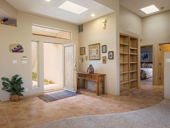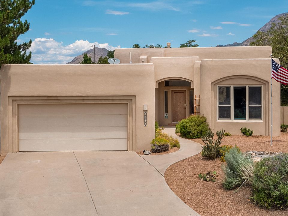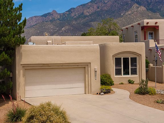 Fall in love with this custom Scott Patrick residence located in sought after High Desert on a corner lot capturing beautiful views of the Sandia Mountains! Step inside to an open & natural light filled, single level home with 3 bedroom's, including the 3rd bedroom w/en-suite bathroom. Generous great room w/soaring raised ceiling, gas log fireplace, built-in book shelves, formal dining area & wall of windows framing the picturesque xeriscape backyard! Delightful kitchen w/center island, pantry, breakfast nook with VIEWS & planning desk. Master retreat offers wall of windows w/mountain views, gas log fireplace & master bathroom w/jetted tub, separate shower & large walk-in closet! Enjoy the foothills hiking, biking & walking trails! Updated windows & a NEW water heater in 2023! TRUE GEM!