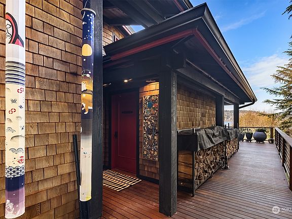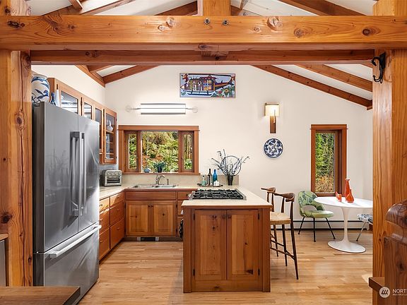 Artistic post and beam architecture and incredible craftsmanship inform this Northwest timber-frame home on Vashon's coveted West side. Light-filled interiors with fantastic views of Colvos Passage and the community meadow are trimmed and supported by clear fir throughout. With decks on every level and the primary suite in an aerie on the top floor, this home will delight and surprise. Renewed entry landscaping with substantial stonework, all new hardwood decks, new wood stove in living room, new hot tub, all new stainless appliances & new stacking w/d in guest room. Detached studio with its own deck has water supply for crafts. Garden space below and shared ownership of 175 feet of beautiful beach. An incredible opportunity.