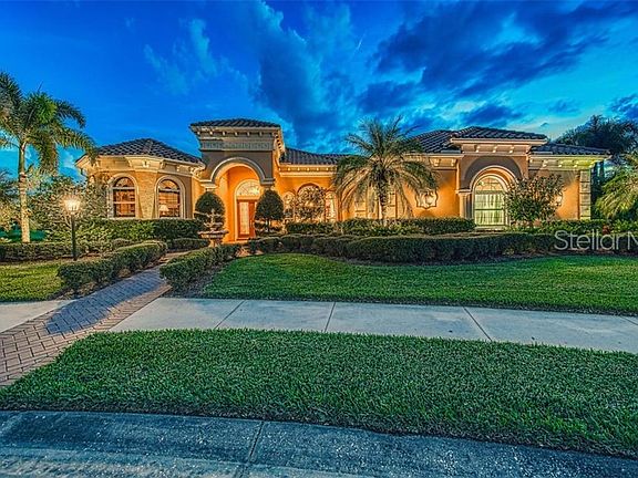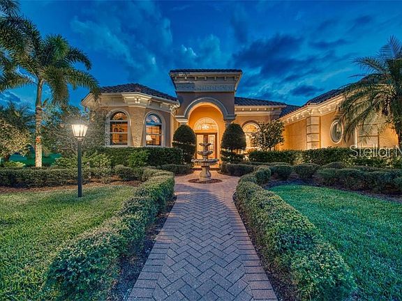With the most exceptional lake and golf course view, this perfectly situated residence on the private cul-de-sac in Lakewood Ranch Country Club is one to admire. From first glance, one cannot help but notice the exquisite architectural details including entry stone fountain, intricate crown moldings, travertine floors, crystal chandeliers and custom window treatments. Separate den with leather walls and built in desk is exemplary sophistication. Kitchen is unlike any other with separate refrigerator and freezer, two dishwashers, top of the line appliances, oversized island, and state of the art water system. Master suite has a true his and hers closet with luxurious master bath with soaking tub and walk in shower. Walk thru any set of Automatic sliders to the incredible outdoor area with stone fireplace, pool and spa, outdoor kitchen with seating area while basking in the sun and taking in the magnificent views from any direction. Make your way upstairs to the spectacular bonus room with wrap around balcony and adjacent guest suite. Other notable features include two additional oversized guest suites with walk in closets, separate dining and living area with fireplace, side entry garage, 3 new A/Cs, and upgraded security system. This is a home where no detail has been missed and for someone who truly appreciates the best of the best.