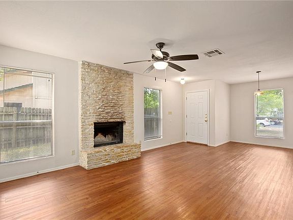 2/1 duplex with an open living, kitchen, and dining area, including a pass-through breakfast bar. Wood look floors in all rooms with a limestone fireplace focal point in the living area. Good cabinet and storage space. Laundry closet with shelving off the kitchen. Backyard patio with shade. Tenant pays all utilities. $80 app per person. $150 admin upon approval. $300 nonrefundable pet deposit.