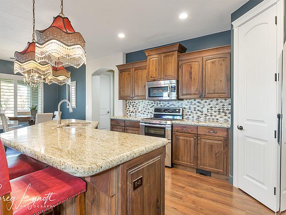 Beautiful home located in Silver Falls w/ city and pine valley Mountain View’s. Endless upgrades include as follows: -customized millworker in the wallpapered entry - mirrored vaulted ceiling w/ a chandelier in entry - coffered family room ceiling with gorgeous beams - luxury vinyl plank flooring (lvp) - granite counter tops in kitchen, laundry, & bath rooms - ceiling fans in family room and all bedrooms - recessed lighting in all rooms - 4th bedroom can be office. Has French doors - master bedroom showcases a large en-suite w/ a soaking tub, walk-in shower, and walk-in closet w/ customer built-ins. -3 car garage w/ polished concrete flooring - 3rd garage converted to food storage area with air conditioning or can be used as a workshop. Separated from other part of garage by a custom built wall - beautiful, warm, and inviting gas fireplace - custom paint throughout home - very large patio faces north and has views of mountains and valley - view of new Washington Temple from front yard - small courtyard on front of house with gated entry - extra insulation and radiant barrier added to attic - plantation shutters on all windows - low maintenance desert landscape - hot tub