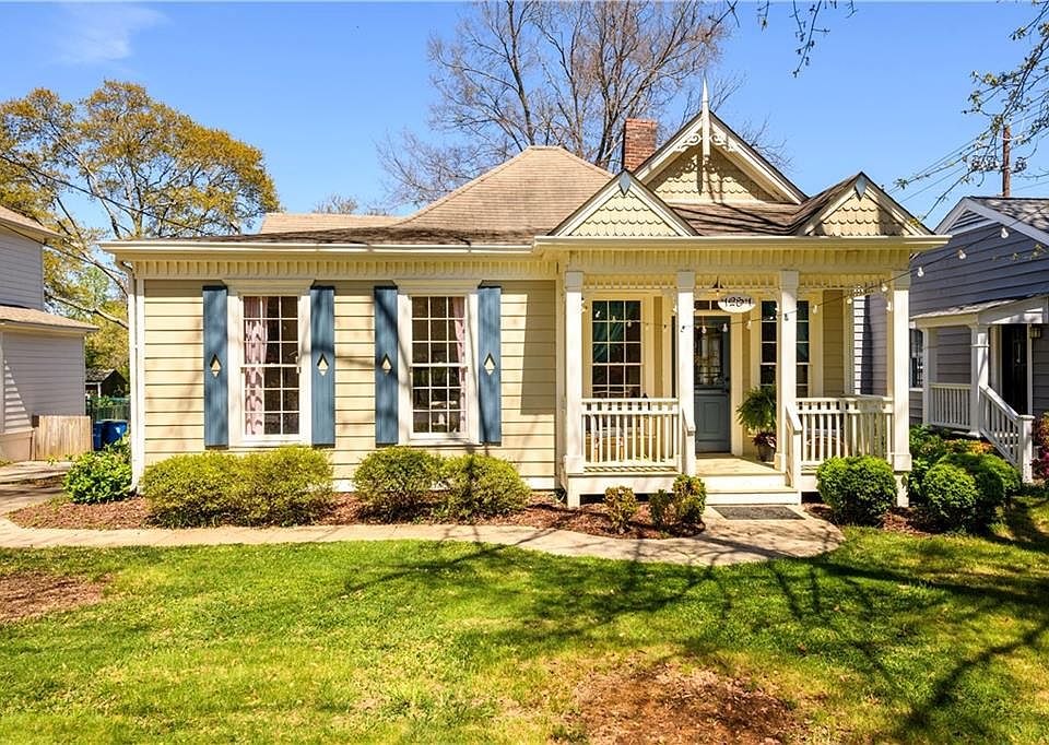 Welcome to sought after Egan Park! Rare American Gothic Revival style cottage circa 1906, boasts gorgeous ornamental exterior trim detail, cross-gabled roof, 10ft plus interior beadboard ceilings, 2 decorative fireplaces and original pine floors! Oversized windows allow for amazing natural light throughout. Separate living and dining rooms blend seamlessly for perfect entertaining. Large kitchen features stainless appliances to include a Hallman 5-burner, dual fuel range for the discriminating chef, beautiful marble countertops, farmhouse sink and dedicated pantry. Primary bedroom has walk in closet and nicely updated bathroom. Two secondary bedrooms, one of which is perfect for home office and hall bath complete the layout. Large rear deck is right off the kitchen and steps down onto fenced back yard. Large storage shed with power would make a great workshop! Historic Egan Park is a close knit, vibrant community just minutes away from Woodward Academy, downtown East Point and getting to Atlanta-Hartsfield airport is a breeze!