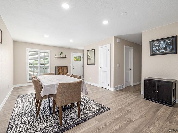 Welcome to your dream home located in Thornton, CO! This East/West facing property displays a 2-car garage, mature landscape, and a welcoming front porch. Discover an appealing interior boasting a formal living room and harmonious great room paired with a delightful fireplace and sliding glass doors to the back patio. Neutral paint promotes an inviting vibe, complemented by wood-look & flooring, plantation shutters, and baseboards. Spotless kitchen features plenty of cabinetry with crown moulding, tile backsplash, recessed lighting, stainless steel appliances, and sleek quartz counters. Unwind and rejuvenation await in the romantic primary bedroom, showcasing a walk-in closet and an ensuite with a floor-to-ceiling tiled shower. The basement is half finished, includes a HUGE bonus room that can be conditioned as a recreation center, hobby room and secondary bedrooms ideal for your overnight guests. You'll surely love the serene backyard, offering a storage shed, green lawn, swaying trees, and a covered patio where you can relax in the morning or afternoon. Don't miss out!