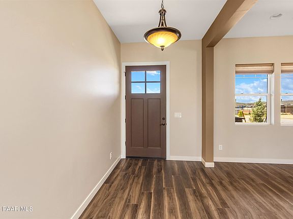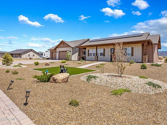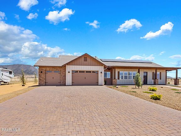 Built in 2020 this beautiful Saddle View Home is completly fenced and landscaped. Property backs 8 acre parcel then on to State Land. Lightly lived in with beautiful rock firerplace see through to back patio, spacious dining, antique white cabinetry, and vinyl wood plank flooring throughout. Bedrooms 2 and 3 share a Jack and Jill bath with private vanities. Oversized master bedroom and wait till you see the 10x10 master closet and large laundry room! Garage has several ceiling storage racks and epoxy floor. Paved driveway and over sized front porch and back patio great for taking in Mingus Mountain and more. Bring the toys and enjoy country living at its best. Well produces over 25 GPM. leased solar panels plus a whole house water filtration and are an added bonus.