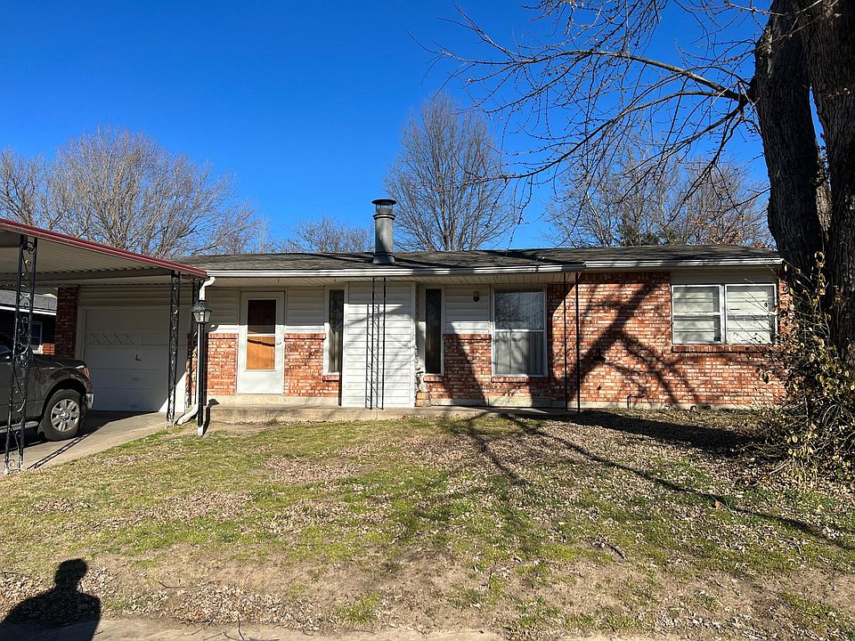 Updated interiors with 2023 fireplace, 2023 electric oven range, brick/vinyl siding, new roof 2017, new heat and air 2016, fenced yard, extra wide driveway with carport, 1-car garage, and shed in the backyard