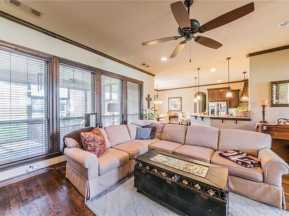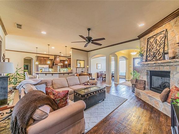 Custom built home in the gated community of Santa Fe Estates. Located in high performing Mansfield ISD. Hand scraped wood flooring and marble counter tops. Butler's pantry with wine fridge. Stainless steel appliances with gas cook top and double ovens. Spacious bedrooms all have their own bathroom. Master suite has custom over-sized closets, walk in shower with double shower heads and stepped ceiling with double crown molding.Upstairs media room with sink. Enclosed outdoor living area with fireplace. Storm resistant roofing. FEMA registered underground storm shelter in three car garage. Full list of upgrades in documenents. Fresh paint and new french drain. All lawn equipment is negotiable.