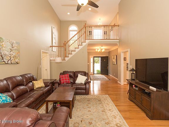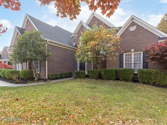 Located on a double cul-de-sac in sought-after Hillcrest, this open and flowing layout home has been beautifully maintained and updated, and is perfect for gatherings and entertaining. You are greeted with a spacious light filled foyer that leads to a two-story great room with hardwoods, ceiling fan, and a gas log fireplace. The eat-in kitchen was remodeled in 2018 with white cabinetry, granite tops, tiled backsplash, and an enlarged island. It also features a breakfast bar, hardwood floors, a walk-in pantry, and stainless appliances – all replaced in the past five years - and opens into a 12'x12' sunroom with tile flooring and a ceiling fan. The private first floor primary bedroom suite has a octagon tray ceiling with ceiling fan, and en-suite primary bath with a double sink vanity, jacuzzi, tile shower, and spacious walk-in closet. There is also a formal dining room, 1st floor laundry, and half bath. The open staircase leads to a second story sitting area and three large bedrooms, two with walk-in closets, and one with direct access to a full bath with a dual sink vanity. The roof, gutters, and downspouts were replaced in 2017 and there is also a deck, irrigation and security systems, electric car charger, underground dog fence with two collards, and an oversized garage. The large unfinished basement has loads of opportunity for finishing. The .35-acre lot includes mature plantings, bushes, and trees and new mulch. The neighborhood features a clubhouse, swimming pool, tennis court, and a playground. Oldham Country has one of the highest concentrations of top ranked public schools in Kentucky.