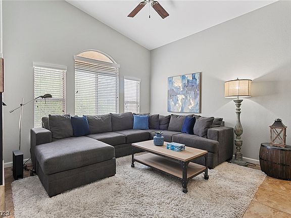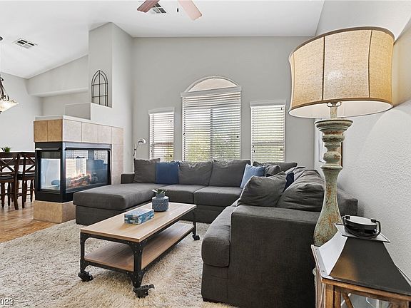 This fantastic town home is ready for move-in! 2 bedrooms, 2 bathrooms, and an attached garage. Features include neutral two-tone paint throughout, vaulted ceilings, three-way gas fireplace in the living room, tile/wood-look flooring throughout, separate laundry room, ceiling fan and walk-in closet with custom shelving in the primary bedroom. The open kitchen boasts a breakfast bar and stainless steel appliances (dishwasher and garbage disposal were just installed). Great gated community in Henderson has a playground, pool, park, and more! Come view this amazing property today!