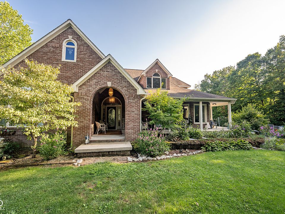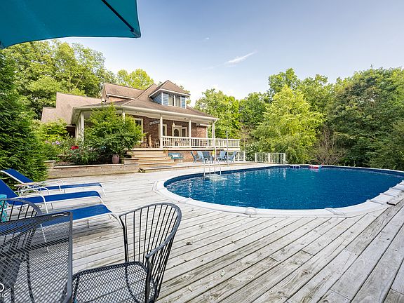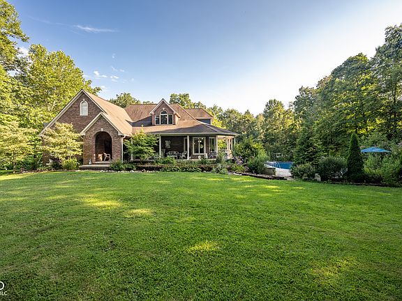 Private wooded retreat with custom home on walk-out basement, large pool and mature perennial gardens on 1.68 acres at the end of a long lane. This custom brick ranch has tons of space on every level. The main floor a formal living room with fireplace, formal dining room, eat-in kitchen with granite counters and modern cabinets, a 2-story entry, laundry room, 2 bedrooms and 1.5 baths. The walk-out basement includes a loads of entertaining space with a family room with fireplace, large bar, guest bedroom, several storage closets, 1/2 bath, and 2-car garage. The second floor features 2 bedrooms, a bonus room, full bathroom, and office space. The primary suite opens on to the deck, has a sitting area, a walk-in closet and half bath plumbed for a new walk-in shower. Newer custom finishes throughout the entire home. All appliances included. Enjoy the views of nature from the wrap-around covered porch, open deck, lower paito or pool decks. Pool has plenty of sundeck space and a custom waterfall. Follow the paths through arbors with vining flowers to the potting shed or fire pit. There are several large yard spaces for play. Total privacy at the end of the road with peace and quiet.