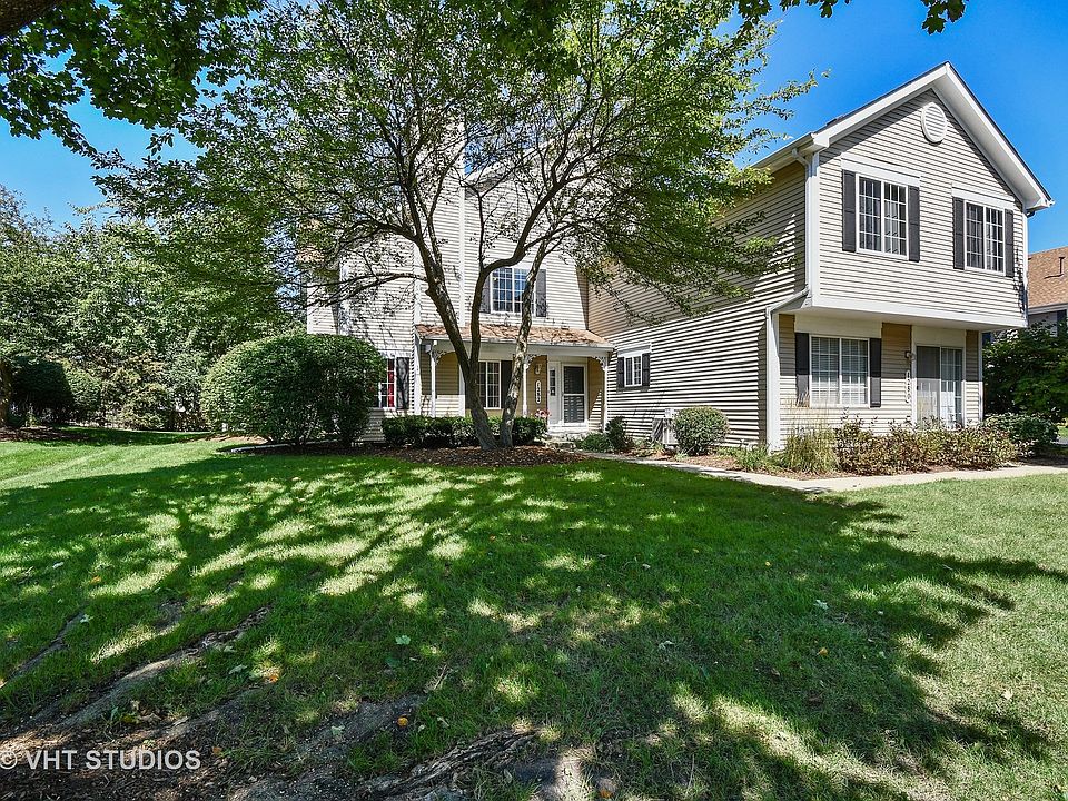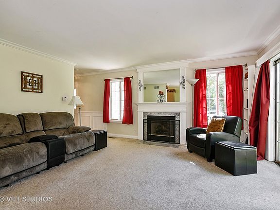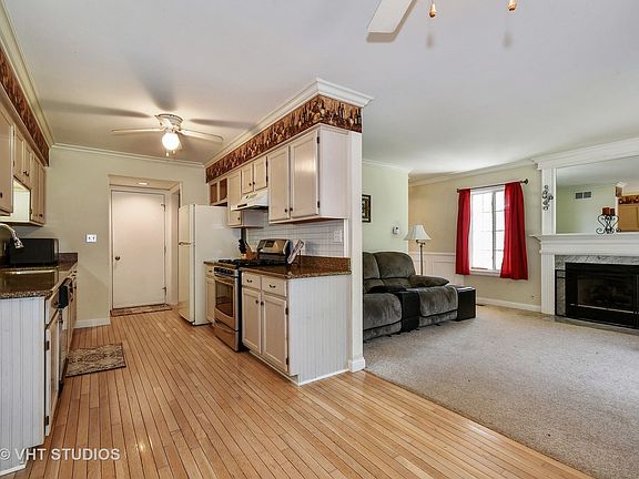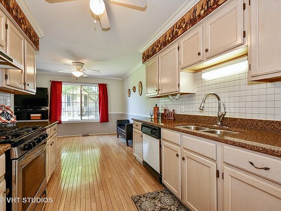 GREAT end unit in coveted Carriage Homes of Sandhurst! Light-filled living room with fireplace creates a wonderful space for conversation and relaxation. Dining area with hardwood flooring is spacious and convenient to both the living room and kitchen. Kitchen features tons of cabinet space, hardwood floors, and granite counters. Upstairs includes a HUGE master bedroom with his/her closets, big windows that fill the room with light, a large hall bath, and a good sized second bedroom with ceiling fan. You can entertain family and friends in the large finished lower level where you'll find a fabulous custom wet bar, mini-fridge, and space for a large TV. Laundry room is adjacent to the finished area. Plumbed with a toilet, the laundry space could be reconfigured as a second full bath. This town home is conveniently located near parks, shopping, METRA, upper Randall corridor, and the Fox River. Quick close possible. Needs TLC and your decorating ideas! SOLD AS-IS