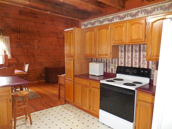 Beautiful 2 bedroom, 1 bath log cabin home in the country! The Kitchen has a bar for extra seating and is open to the dining area. Large living room with cathedral ceiling, and Red Oak hardwood floor. Stairway leads to a loft sitting area overlooking the living room. Outside you will find a private back deck area, with built-in seats, a covered front porch complete with porch swing, a two car detached garage, and a paved driveway. Two additional out-buildings, fruit trees, grape vines, some nice mature trees, nicely landscaped and plenty of room on 9.809 acres. A great private setting, for an affordable, move-in ready home!