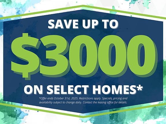 - Special offer! Save up to $3000 on select homes! *Offer ends October 31st, 2025. Restrictions apply. Specials, pricing and availability subject to change daily. Contact the leasing office for details.