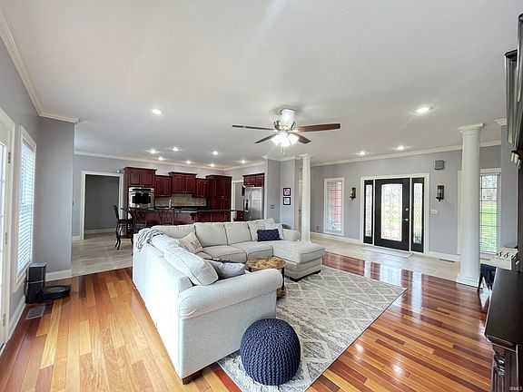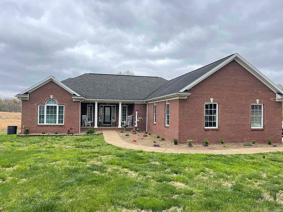 Welcome to this Charming Country Home with Modern Amenities nestled on the outskirts of Lynnville just a couple miles off interstate 64. Boasting a perfect blend of traditional charm and modern comforts, this property offers a sanctuary for comfortable living on just a little over 6 acres. Spacious Layout: With a generous open floor plan, this home provides ample space for family gatherings and entertaining guests. The open-concept design seamlessly connects the living, dining, and kitchen areas, creating an inviting atmosphere for relaxation and socializing. Modern Kitchen: The gourmet kitchen is a chef's dream, featuring sleek granite countertops, stainless steel appliances, custom cabinetry, and a spacious island with seating. Whether you're preparing a casual meal or hosting a formal dinner party, this kitchen is sure to impress. Comfortable Bedrooms: Retreat to the luxurious master suite, complete with a very large walk-in closet and an en-suite bathroom equipped with a soaking tub, dual vanities, and a separate large walk-in shower with dual shower heads. Additional bedrooms offer plenty of space for family members or guests, each appointed with ample closet space and large windows for natural light. Bonus Features: This home comes with a massive walkout basement ready to be finished along with a bathroom already plumbed-in, a laundry room with washer and dryer and utility sink just off the 3 car garage. Don't miss the opportunity to make this stunning property your forever home. Experience the perfect blend of luxury, comfort, and country living!