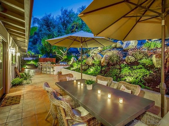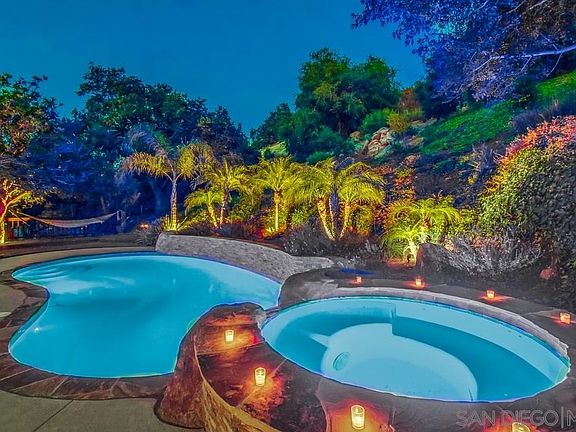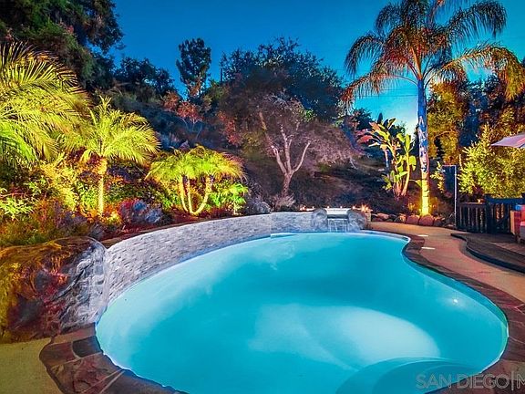 Single level home in sought after neighborhood of Green Valley. Sited on 2.17 tranquil parklike lot with mountain views. The backyard showcases a pool/spa with waterfall. Spacious living room with fireplace and expansive windows to views. Family room features French door to patio and adjacent gourmet kitchen complete with farmhouse sink, stainless steel Viking appliances including gas range and hood, microwave, built-in refrigerator and dishwasher, island and custom cabinetry. Highly upgraded. Single level home in sought after neighborhood of Green Valley. 4BR/2BA, Approx. 2000 sq. ft. Sited on 2.17 tranquil parklike acres with mountain views. Spacious living room with fireplace and expansive windows to views. Family room features French door to patio and adjacent gourmet kitchen complete with farmhouse sink, stainless steel Viking appliances including gas range and hood, microwave, built-in refrigerator and dishwasher, island and custom cabinetry. Relaxing master suite features remodeled ensuite master bath and walk in closet. The backyard showcases a pool/spa with waterfall, entertaining area with built-in BBQ, patio and deck area. Towering mature trees, flowering plants and natural boulders and outcroppings. Highly upgraded with whole house SOLAR (owned), wood flooring, Pella Windows, new entry door with side light, whole house water filtration system, custom closet in 4th BR, newer water heater, pool remodel with new equipment, replaced roof underlining paper, garage with epoxy flooring. No Mello Roos or HOA. Highly acclaimed Poway Unified School District.