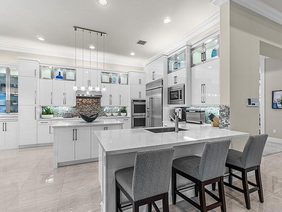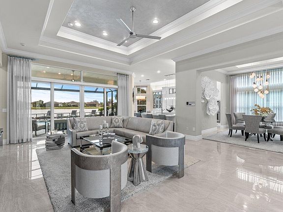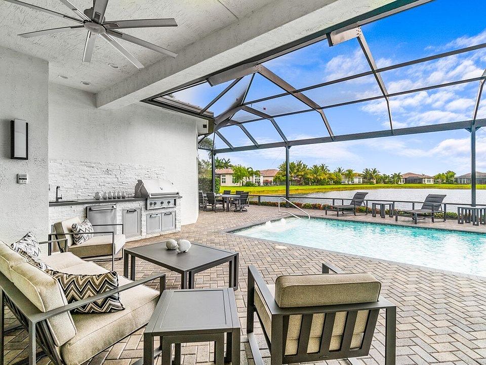 Prime lake view pool home with 3 bedrooms, 3.5 baths plus a large Club Room and an additional office. Designed by Brown's Interiors, this Carlyle Model is simply magnificent. There are way too many upgrades to mention but highlights include the following. Not a dime spared on upgrades including impact glass windows and doors, 24x24 rectified porcelain tile, Carrier's top of the line A/C system, Hunter Douglas remote control blinds in most rooms, built-in wall units, central vacuum system, intercom system, Kitchenaid appliances, Etched glass front door and matching transom and so much more. Outdoor upgrades include a full house generator, summer kitchen, lush landscaping, large heated salt water pool w/fountain deck, full yard screen enclosure with picture window screens.