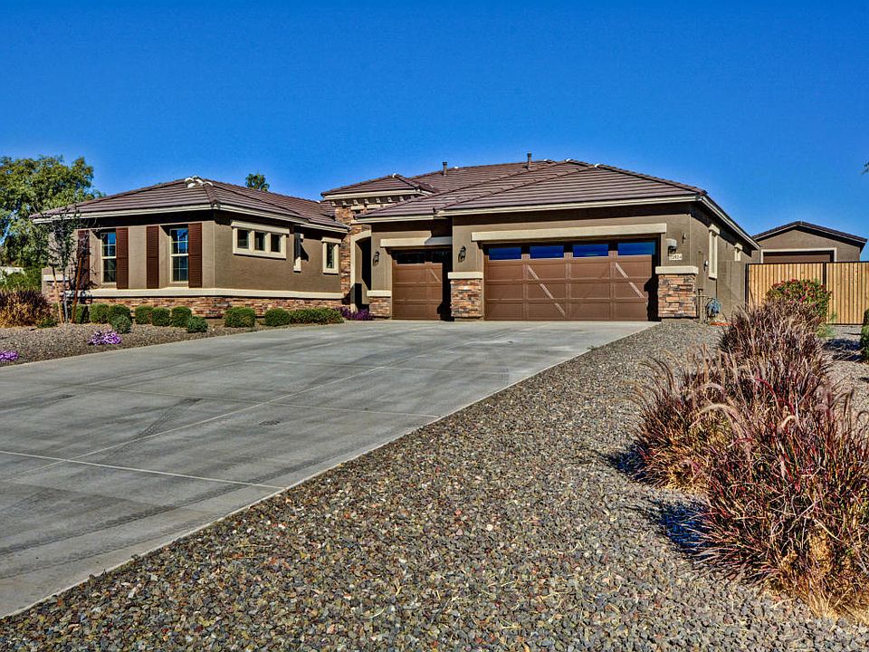 Stunning former model home on landscaped acre lot! Three-car attached garage plus detached 20x40 RV garage and an RV gate! This Harlan 3100 sq. ft. floor plan features a great room, 3 bedrooms plus a study, ''teen room'' and 3 bathrooms. The gourmet kitchen boasts a center island, granite countertops, stainless steel appliances and tile backsplash. The master suite is split from the other bedrooms, and features tile accents, 2 sinks and a separate tub shower in the master bath. Every bedroom has a walk-in closet. The backyard oasis boasts a covered patio, ramada with firepit, grassy play area, and water retention area. The location is minutes from schools, freeways, shops and the attractions at Westgate Center, which is even visible from the property! The RV garage has a full bath!