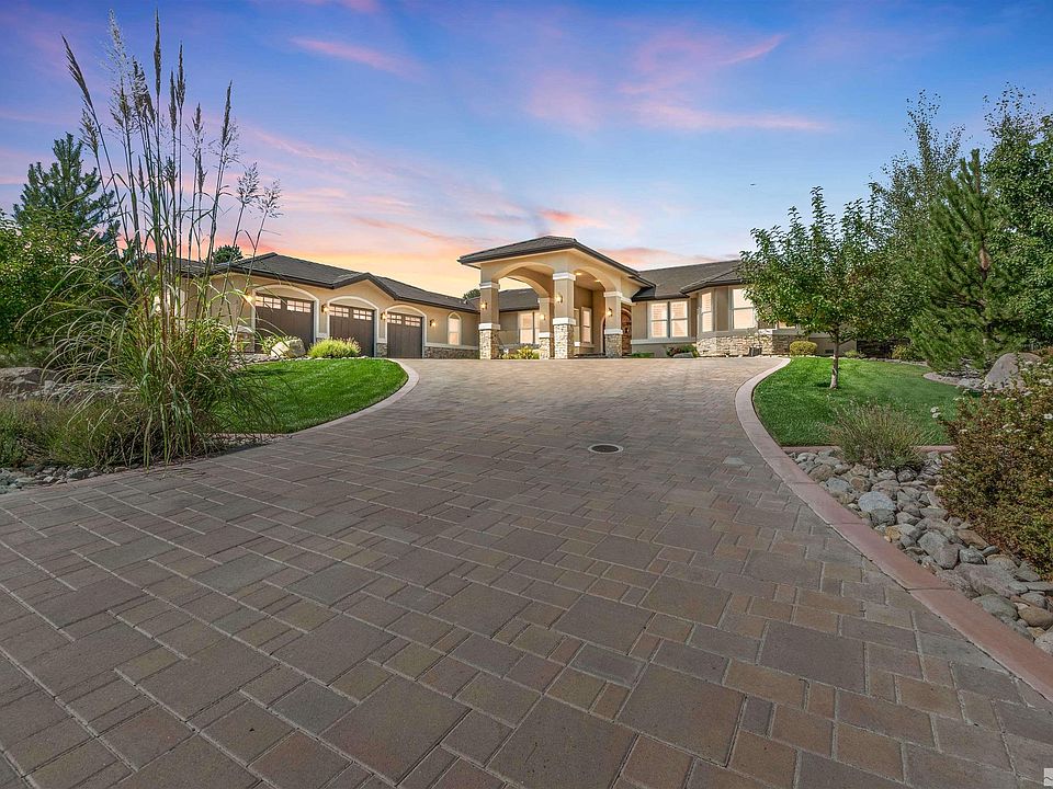 A stunning residence nestled in the prestigious Fairways at Field Creek Ranch, a luxury gated community adjoining the Wolf Run golf course. This exquisite home boasts breathtaking views of the mountains and is situated on a generous .65-acre lot. The gourmet kitchen is a chef’s dream, featuring a top-of-the-line Wolf range oven and KitchenAid appliances, complemented by beautiful granite countertops. Elegant coffered ceilings adorned with crown molding and custom rope lighting add a touch of sophistication, Throughout the home, you will find stained custom doors and luxurious marble tile floors in all bathrooms. The primary bedroom has a large walk in shower, steam option and jetted tub. There are 3 fireplaces and the oversized 3 car garage has a beautifully finished epoxy floor. The curb appeal on this beauty is second to none and also features a Porte Cochere for your guests to unload upon arrival. Additional features include a state-of-the-art ADT alarm system equipped with nine cameras and video recording capabilities, along with a Google Nest doorbell and thermostats for seamless control. Enjoy the convenience of smartphone-controlled garage doors. The home is further enhanced with Hunter Douglas Powerview roller and screen shades, as well as Palm Beach Poly satin shutters. All wall-mounted TVs are included, making this home truly move-in ready. Other amenities include a warming drawer, wine fridge, and a beautiful custom front door. House is also plumbed for a central vacuum and there is a steam shower in the primary bedroom. Don’t miss the opportunity to make this exceptional property your own!