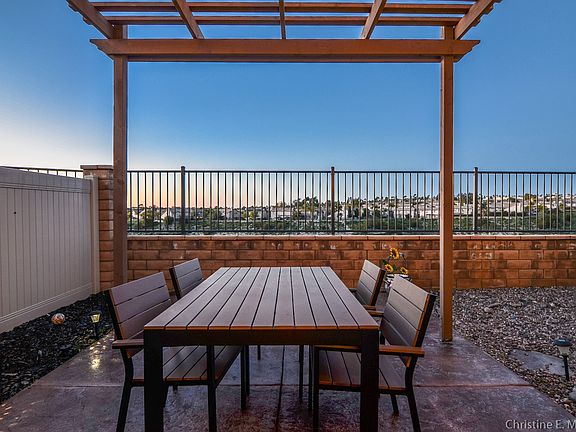 The house features an outside area that sits atop a hill with a great view, with stamped concrete and pergola to enjoy the sunsets with. Inside features an open floor plan with tile floors, granite counter tops, and matching stainless appliances. Upstairs is a laundry room, and plush upgraded carpeting. A bathroom connects to both guest bedrooms. Master bedroom is nice sized with a large bathroom and closet attached. It’s a great community with a new club house, pool, gym, elementary school, and parks.