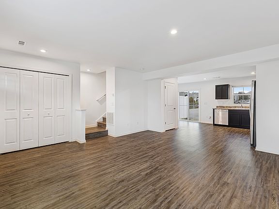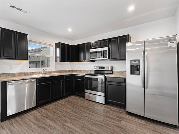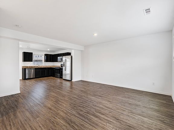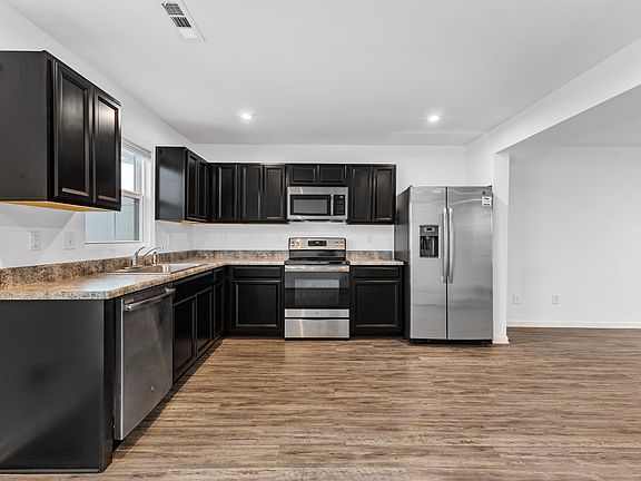 Open and inviting floor plan featuring vinyl plank floors throughout the main areas, with cozy carpet in the bedrooms. The main level features a contemporary kitchen, complete with sleek appliances and ample cabinet and counter space, flowing seamlessly into the adjacent dining area and cozy living room. This home offers three bedrooms, including a master bedroom with an ensuite bathroom and walk-in closet. The additional bedrooms are spacious and share a second bathroom, both with roomy closets. You'll also find an enclosed laundry closet with shelving for added convenience as well.