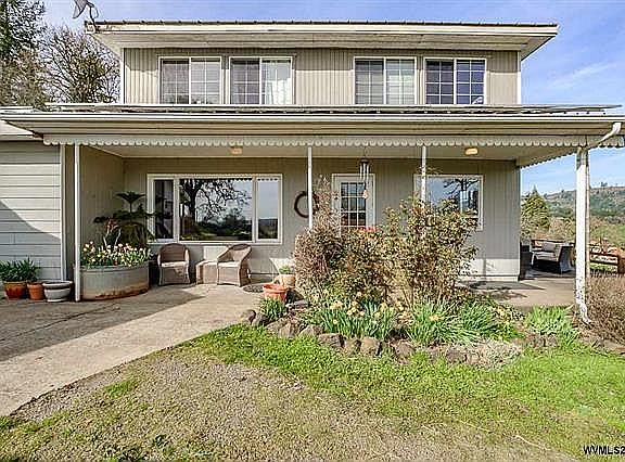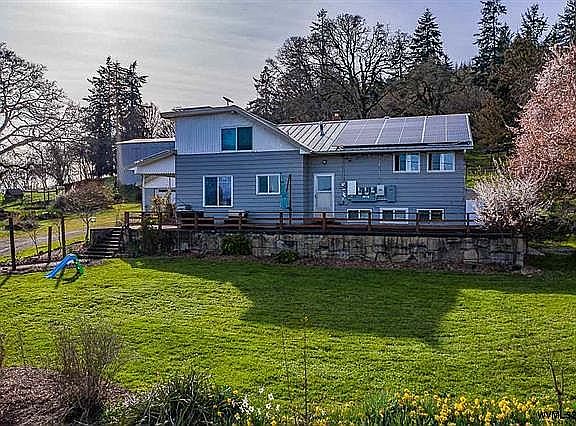 Find your freshly updated 1960s farmhouse centrally located just south of Salem, two minutes off I-5! New 13 KWh solar system with Tesla Powerwall, HVAC, windows, bamboo floors, high end wood stove insert, finished basement space with separate entry, and fresh touches throughout add to the stunning views from every window. 25.38 acres on two tax lots include four acres prime farmland, one acre rated for vineyard, several acres in cross-fenced pasture with large barn. Take walks through acres of mature maple and fir forest. One acre of rain and spring water drip irrigated permaculture orchard will start bearing fruit from 100 different cultivars of trees and bushes this year.