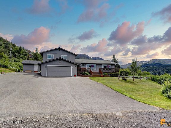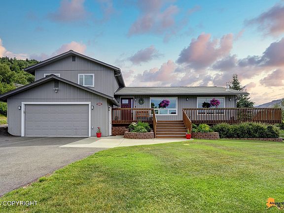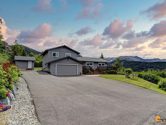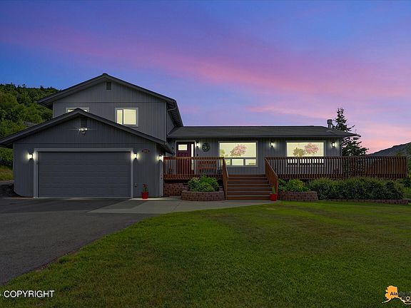Stunning hillside dream home with breathtaking panoramic views from the mountains to the inlet. This beautifully remodeled tri-level offers the perfect blend of modern luxury and natural beauty, ensuring a peaceful and comfortable living experience.The main level features an open concept living room surrounded by windows filling the space with natural light and million dollar viewsin every direction. The updated kitchen is a chef's delight, with quartz countertops, high-end cabinetry with soft close drawers, new appliances, and cleverly planned cabinets for spices, cutting boards, and even a conveniently concealed step ladder cabinet for reaching those top shelves. Under-cabinet lighting and a water filtration system add the perfect finishing touches. In-floor radiant heat on the main floor ensures warmth and comfort during colder months and the Scandinavian gas stove adds to the cozy vibes. All three bedrooms are located on the upper level and all offer views of either the inlet or the mountains. The lower level of the home features a half bath, a large well-appointed laundry room, and the rec room/bonus space that can function as a den, play room, TV area, or possible conversion to a 4th bedroom. The lush yard and meticulously maintained landscaping create a serene outdoor retreat. A freshly paved driveway provides ample space for all your vehicles and toys. The shed/shop is equipped with 30 amp power, and both interior and exterior lighting, as well as a ramp and barn doors for parking snowmachines, ATVs or just providing a great space for hobbies or additional storage. New windows, blinds, and fresh upgrades throughout make this home a move-in ready gem. Nestled in a quiet area surrounded by wildlife, you'll experience tranquility and stunning west-facing inlet views with fantastic sunsets as well as Northern Lights shows dancing over the mountains.