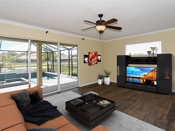 Huge Price Reduction on this amazing home located on a cul de sac in Greyhawk Landing, a gated family community in Bradenton. This home features 5 bedrooms, 3 full baths, a huge bonus/game room upstairs, and outdoor space you may not find anywhere else in the neighborhood. As you arrive at your new home, you will notice the long paver driveway that leads to a 3 car garage and a cute front porch. Downstairs features one bedroom and a bath, a formal living room, formal dining, a huge kitchen and a living room with sliders to the pool and lanai. The kitchen features stainless appliances, Corian countertops, wine and beverage refrigerators, a small buffet and two large pantries. The formal living has been modified with modular desks that can be removed if desired, and both the living rooms have new laminate flooring. Upstairs are 3 more bedrooms, a huge master bedroom with sitting area, and a bonus room that would make an amazing game room or man cave. Laundry room with wash tub is also located upstairs. But the real gem of this home is the lanai and backyard which overlooks a pond. The amazing heated pool and spa has an array of water features and lighting options along with a ton of paver deck space for loungers, tables, outdoor kitchen, etc. A fenced side yard is also great for the little ones or your furry friends. Home has 2 brand new A/C systems, water softener, lanai nebular lighting, sprinkler system, alarm system, outdoor lighting.
