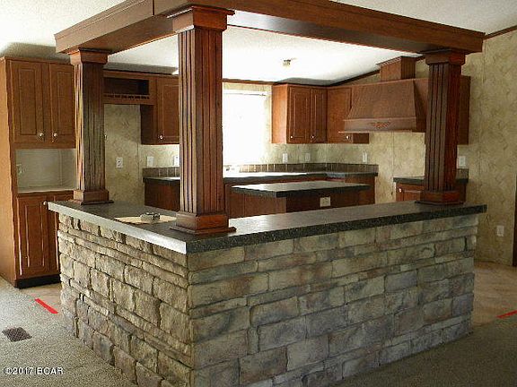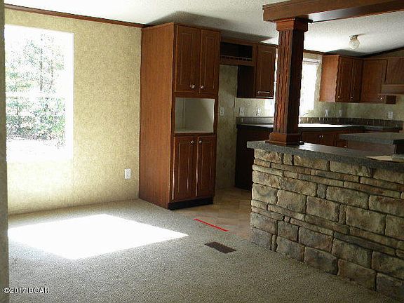 3 bedroom home with split floor plan, open living room with built in shelves, unique kitchen with stone work around a large bar area, kitchen island and lots of counter space. Master bathroom with double vanities, garden tub and separate shower along with a walk in closet. Give it a little TLC and it will be perfect.