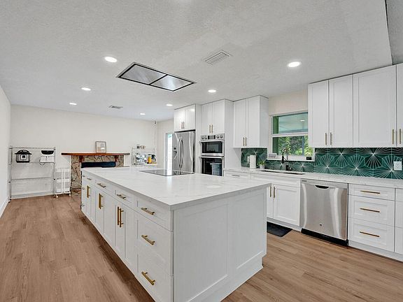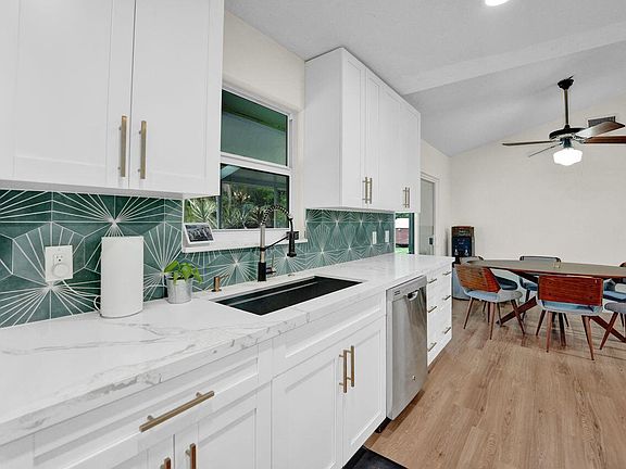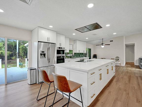 Recently renovated 3-bedroom, 2-bath home with a private office is situated on 1.25 acres in Jupiter Farms. Updates include impact windows and sliding glass doors (2021), metal roof (2020), HVAC (2018), and both bathrooms are fully renovated. The impressive kitchen (2022) features a massive island, tons of white designer cabinetry with convenient soft close features, sleek quartz counters, and stainless-steel appliances. Vinyl plank flooring (2022) runs throughout the entire home. Vaulted ceiling and impact sky lights make the home feel spacious and allows for natural light to fill the kitchen and family room. Off the kitchen and dining area is an enclosed, screened porch that is always shady for year-round enjoyment. A large Trex deck off the porch welcomes outdoor entertainment.