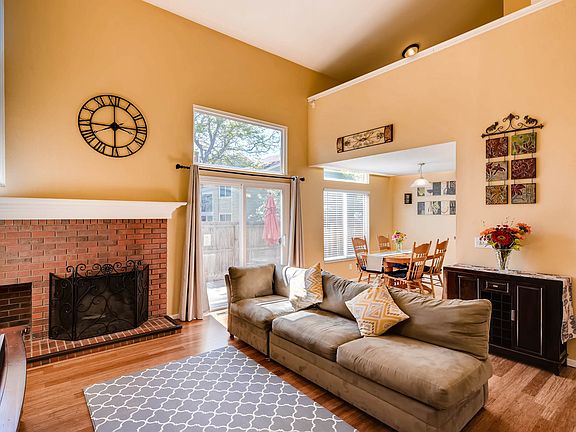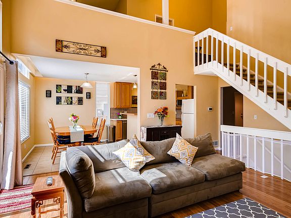 Updated, Immaculate Townhome, walking distance to 9 Mile RTD station. Living rm w/Fireplace, Vaulted ceiling, Bamboo wood floors & tons of natural light, Open Kitchen w/Corian counters, tile floor, breakfast area (all appliances included), Flex space w/wet bar, currently used as an entertainment space, could be a dining room, office, or guest bedrm, Large Pantry/Utility closet & Powder rm round out the main level. The private upper level w/newer neutral carpeting, boasts a Spacious master bedrm w/vaulted ceiling, ceiling fan, ensuite w/the master bath w/granite counter, glass enclosed shower & separate water closet. 2nd bedroom also has vaulted ceilings & fan adjacent to the Full updated tiled Bathrm. Flexible Loft could be an office or 3rd non-conforming bedroom. New windows,blinds & lighting fixtures.Fenced yard w/patio, backing to greenbelt,Hoa covers ext w/ roof, Unfinished basement, 2 car garage. 1/4 mile to the new "The Point at 9 Mile" development on the 225/Parker Rd corner.