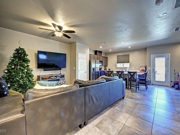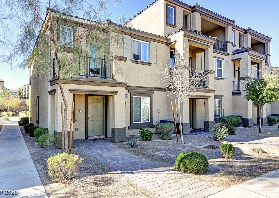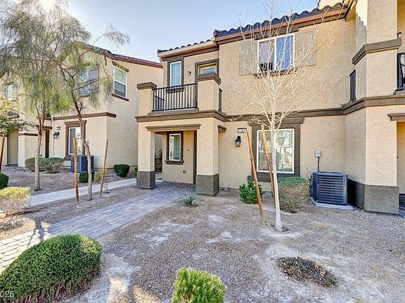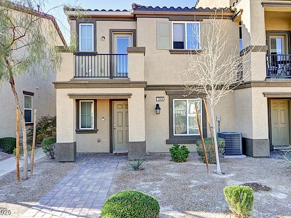 Welcome to this beautifully maintained, move-in-ready townhome offering comfort, style, and convenience. The open-concept main living area features durable tile flooring, recessed lighting, and seamless flow between the spacious living room, dining area, and modern kitchen. The kitchen is highlighted by a large island with seating, sleek countertops, and ample cabinetry—perfect for everyday living and entertaining. Downstairs the primary suite offers plush carpet, a ceiling fan, and a private en-suite bath, while additional bedrooms and main living areas upstairs provide flexibility for guests, home office or entertaining. Enjoy a private balcony with views of the Las Vegas valley (see New Years fireworks), attached garage, and well-kept community amenities including shaded picnic areas and playgrounds. Ideally located near shopping, dining, and major roadways, this home combines low-maintenance living with modern comfort!